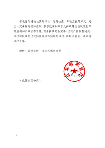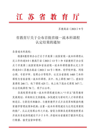 近日,江苏省教育厅公布了首批省级一流本科课程认定结果,我院2门课程被认定为省级一流课程,其中线上一流课程1门,线上线下混合式一流课程1门。