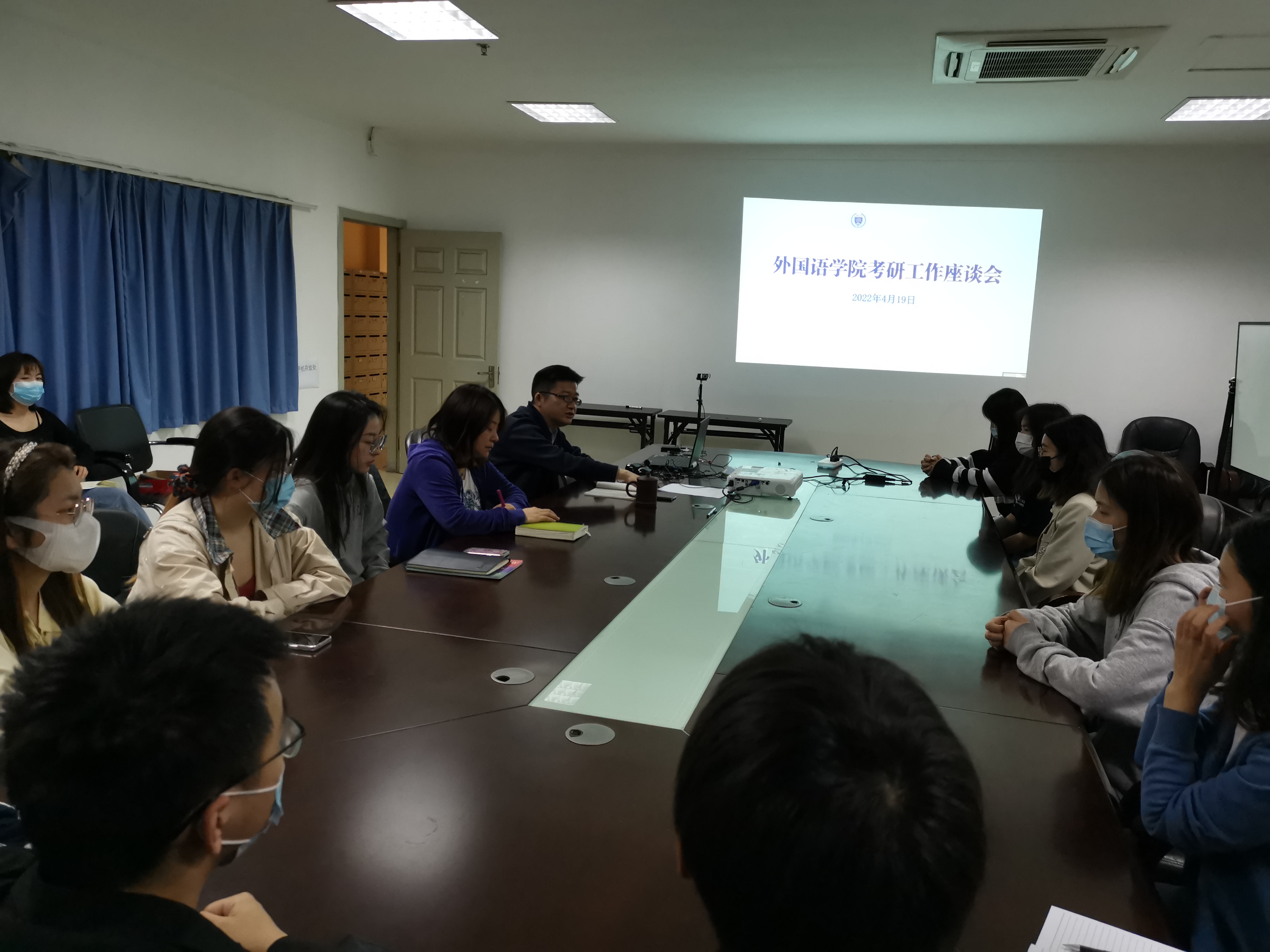 4月19日晚,外国语学院召开考研工作座谈会。会议由院党委书记陈晓波主持,院长袁周敏、副书记兼副院长徐欣娅、副院长吴建、副院长陈琳、各专业系部主任、教工党支部书记、辅导员及2022届成功考研的12位毕业生代表通过线上线下结合的方式参加此次座谈会。