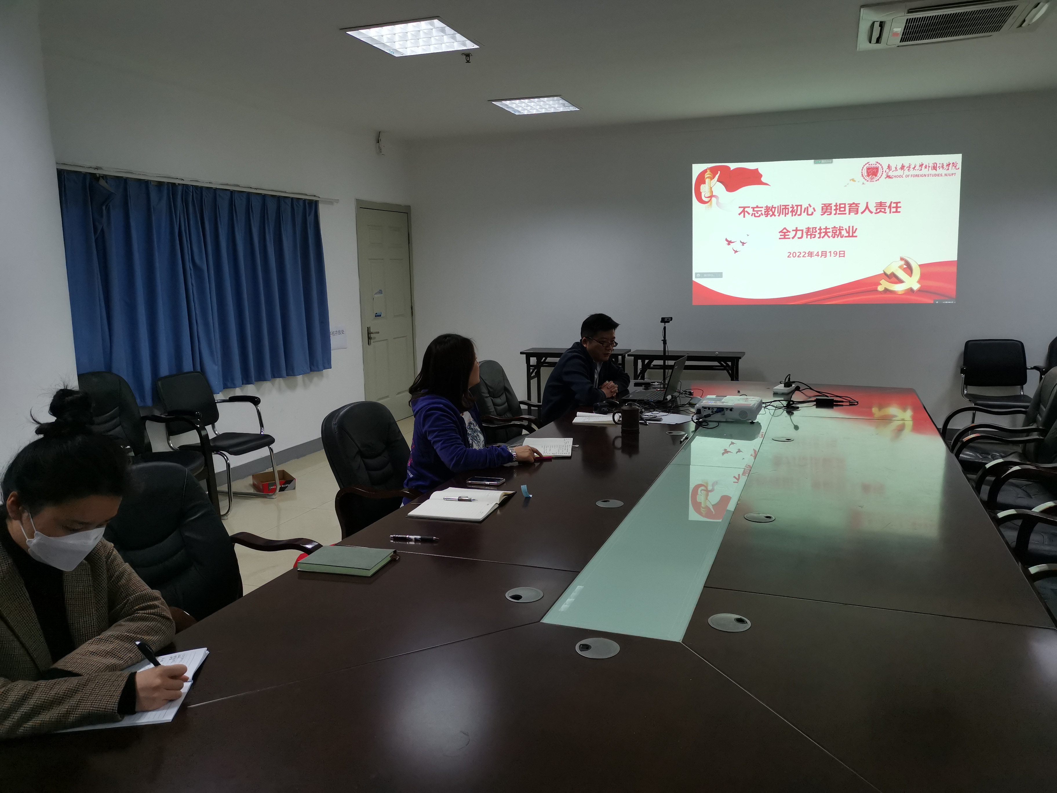4月19日晚,外国语学院召开2022届毕业生就业工作促进会。院党委书记陈晓波主持会议,院长袁周敏、副书记兼副院长徐欣娅、副院长吴建、副院长陈琳、各专业系部主任、教工党支部书记通过线上线下结合的方式参加会议。
