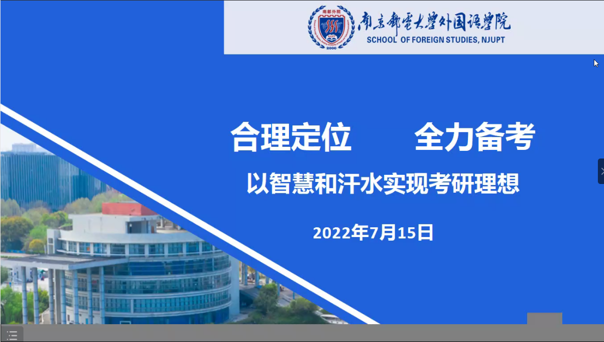外国语学院高度重视学生考研工作,积极创造条件为考研学子营造氛围,提供支持。此次专题辅导,是我院开展暑期云上考研教室系列活动之一,为我院考研学子合理择校和科学备考提供帮助。此外,学院还采取院领导、系部主任与考研学子一对多“小组结对式”推进、“学姐学长面对面”考研经验分享会等常态化举措,坚定学生备考信心,进行精准服务指导,助力学生圆梦。