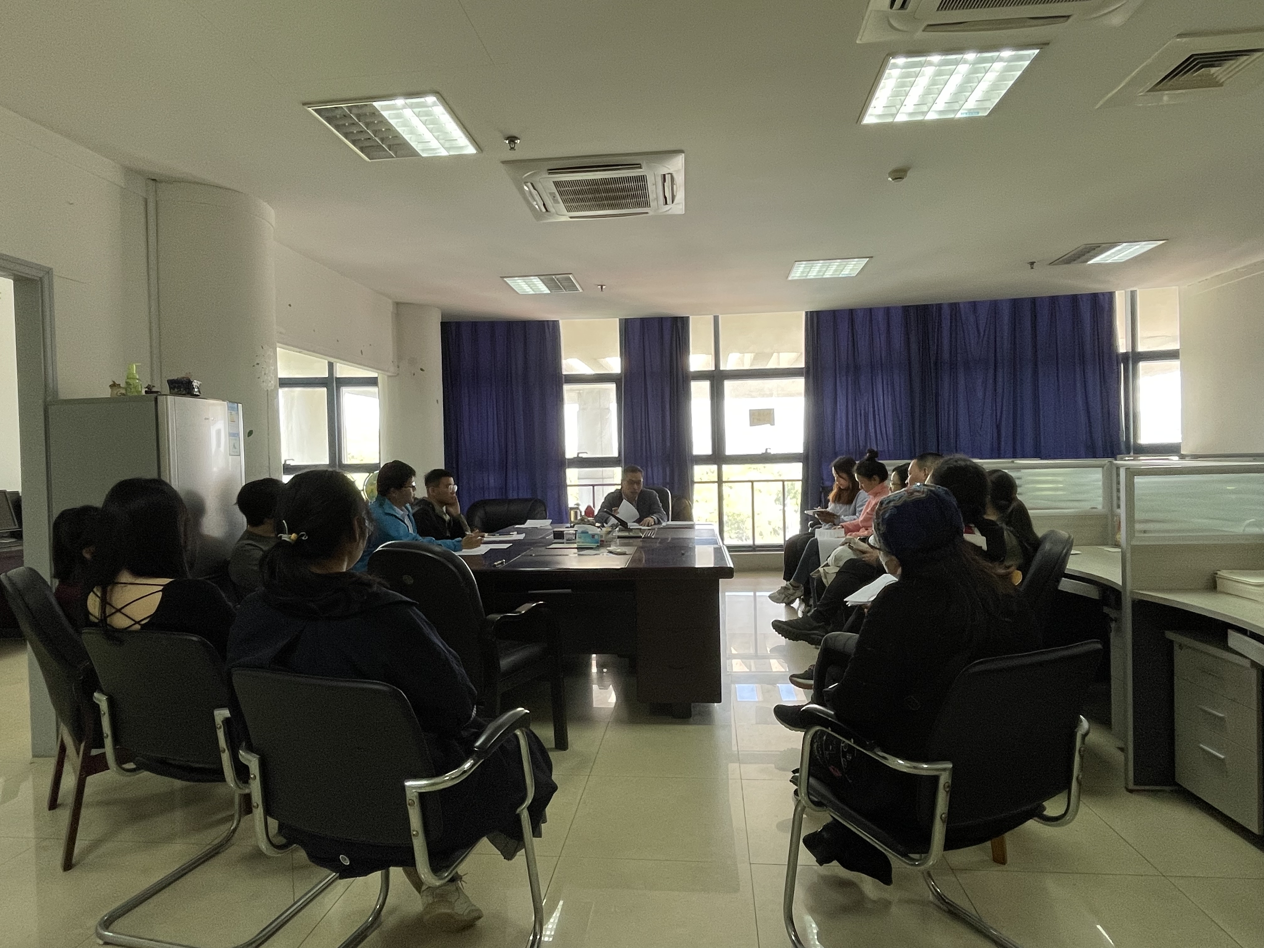 10月12日下午,外国语学院召开坐班人员工作会议,学院全体辅导员、实验室工作人员以及行政人员参加会议,会议由袁周敏院长主持。