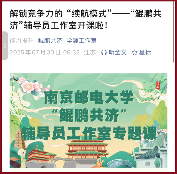 南京邮电大学“鲲鹏共济”辅导员工作室聚焦“学涯”与“生涯”双轨并行,积极探索创新育人模式,前者聚焦铸魂强基,多维立体构建学风建设新格局;后者着重启智润心,全链条打造生涯发展共同体。