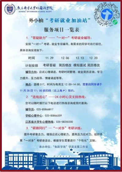 ▲“考研就业加油站”服务项目、考研经验分享会