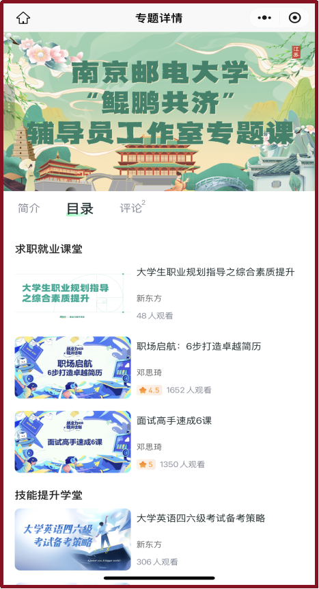 坚持立德树人根本任务,系统构建“鲲鹏共济-学涯工作室”职业导航育人体系。工作室依托“职前成长圈”小程序,精心打造公益性、系统化的线上学习平台,开设涵盖职业素养锤炼、求职就业指导、核心技能提升、科学学业规划四大核心板块的专题课程。平台创新引入AI简历智能测评工具,为学生提供专业化、个性化、即时性的线上简历分析、精准诊断与优化建议,有效破解学生简历制作痛点,将精准就业指导服务前置化、常态化。着力贯通“培训-模拟-实战”全链条育人路径,全面提升学生就业核心竞争力。 工作室匠心打造“简历工坊”赋能计划,并延伸至知名企业实地参访等实践环节,构建起“理论培训赋能、仿真模拟砺能、真实场景练能”的三级进阶培养模式。依托这一模式,持续深化开展“心‘邮’所向,生涯领航”系列品牌活动:从夯实基础的简历制作精训,到沉浸式的“一对一”面试模拟实战,全方位锤炼学生求职实战能力。