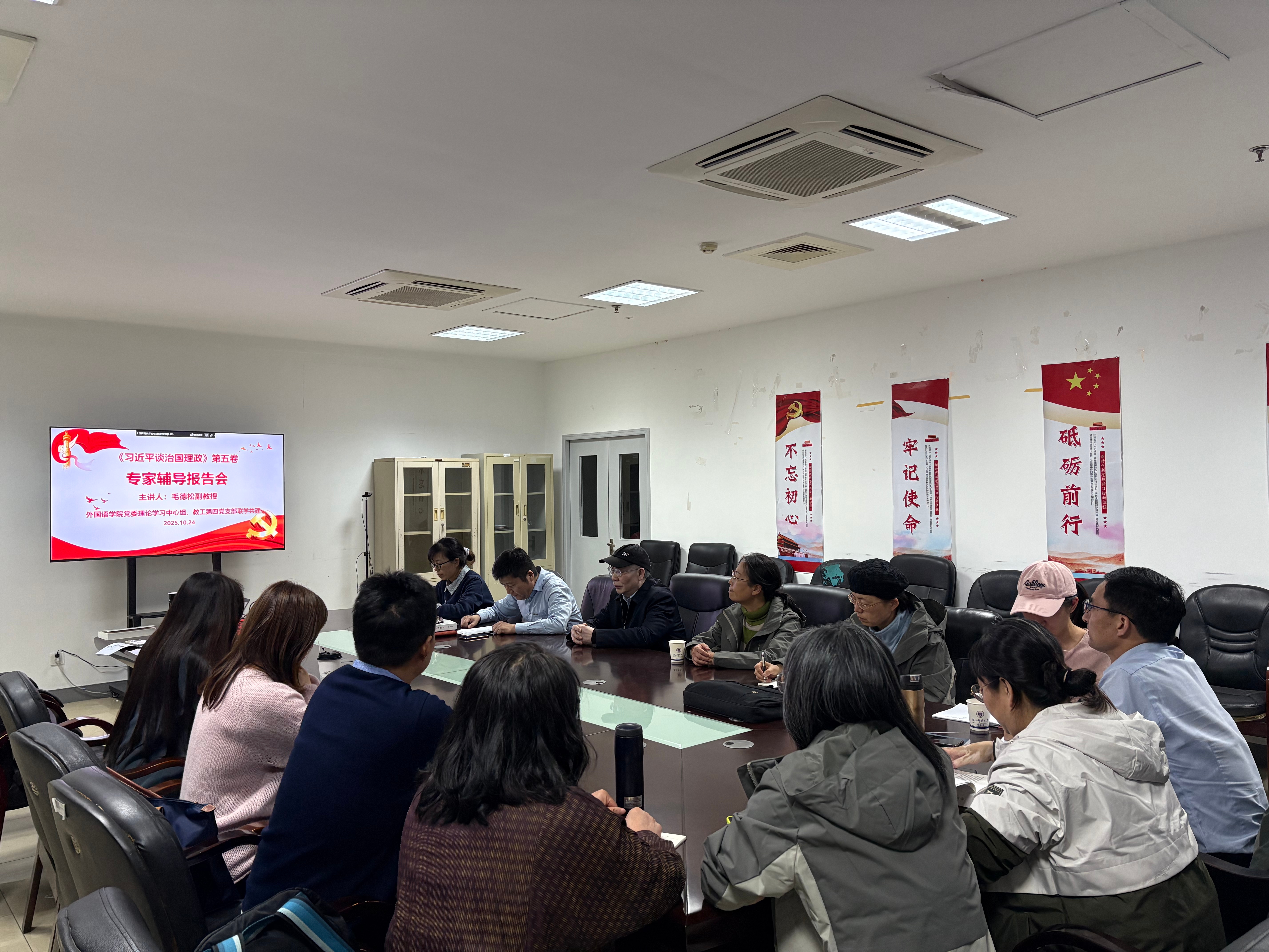 为深入学习贯彻习近平新时代中国特色社会主义思想,深刻领悟党的创新理论最新成果,切实把学习成效转化为推动学院高质量发展的强大动力,2025年10月24日,外国语学院党委理论学习中心组与教工第四党支部联合开展《习近平谈治国理政》第五卷专题学习会。会议邀请马克思主义学院原副院长毛德松副教授作专题辅导报告,学院党委理论学习中心组成员、教工第四党支部全体党员参加学习,学院党委书记陈晓波主持会议。