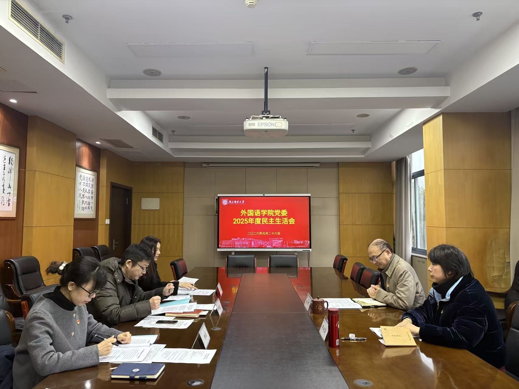 1月26日上午,外国语学院党委领导班子召开2025年度民主生活会。会议深入学习贯彻习近平新时代中国特色社会主义思想,全面贯彻落实党的二十届四中全会精神,围绕锲而不舍落实中央八项规定精神,推进作风建设常态化长效化,深入开展党性分析,深刻剖析问题根源,认真开展对照检查和批评与自我批评。校督导组组长,校党委副书记王友国同志,校纪委委员、物联网学院党委书记邓艳华同志到会督导。院党委书记陈晓波主持会议并作总结讲话。学院党委领导班子成员参加会议。